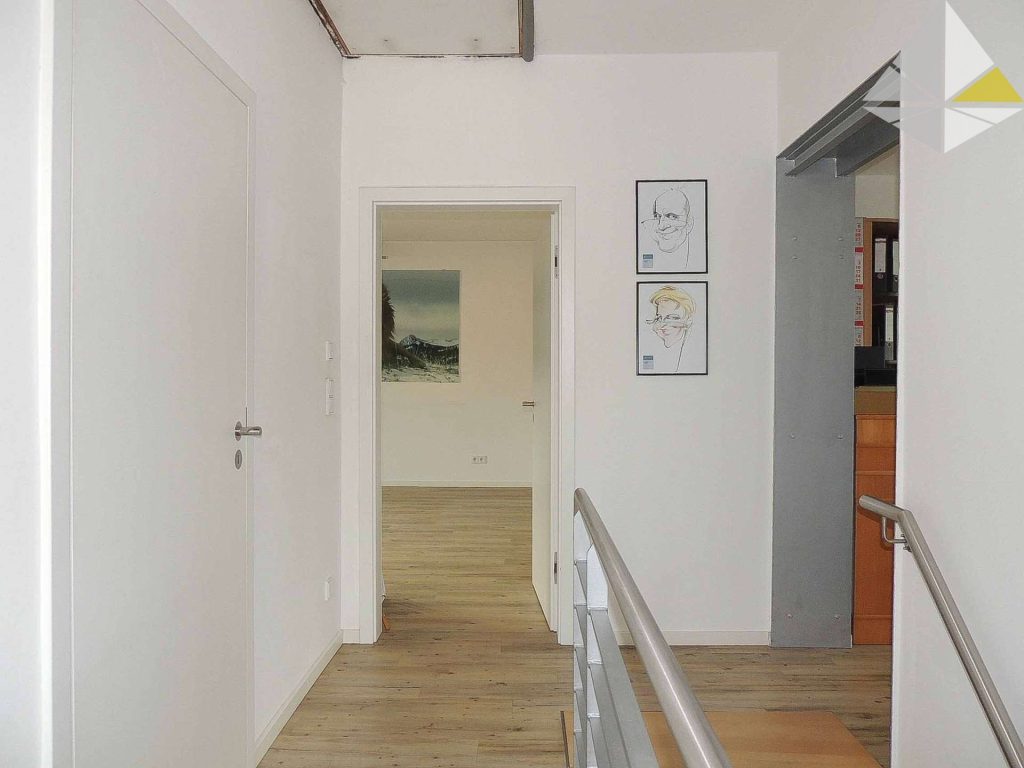 Zur Aufteilung des Hauses: Sie betreten das Haus über einen kleinen Flur, welcher als Garderobe genutzt wird. Hier befindet sich auch das kleine Duschbad. Im Anschluss gelangen Sie in einen großen, sehr gut belichteten Raum, welcher als Esszimmer genutzt werden kann. Hier haben Sie einen schönen Ausblick auf Ihr Grundstück. Bisher diente er als Besprechungsraum. Das Wohnzimmer und die Küche runden die Ausstattung im Erdgeschoss ab. Über die neue Treppe gelangen Sie ins Obergeschoss. Hier befinden sich ein Schlafzimmer, das Hauptbad mit Dusche und zwei Zimmer, welche auch gewerblich genutzt wurden. Diese können sehr gut als Kinderzimmer genutzt werden. Eine Grundrissanpassung ist ohne großen Aufwand möglich.